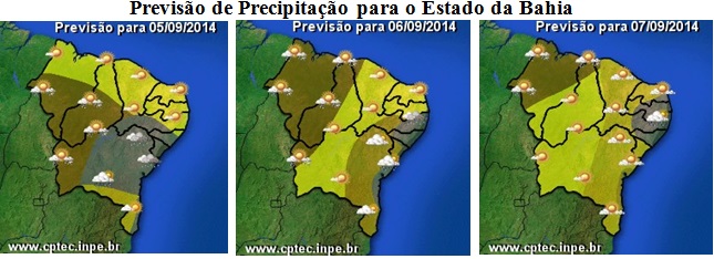 A passagem de uma frente fria pelo litoral da Bahia contribuirá para o aumento da nebulosidade em toda faixa centro-leste do Estado. Nas regiões Nordeste, Recôncavo e Sul, que é onde esse sistema atuará com maior intensidade, o céu se manterá nublado com ocorrência de chuvas a qualquer hora do dia. No domingo, dia 7 de setembro, as probabilidades de chuvas diminuem, e o sol volta a aparecer entre nuvens. As temperaturas deverão oscilar entre mínimas de 16°C e máximas de 27°C.