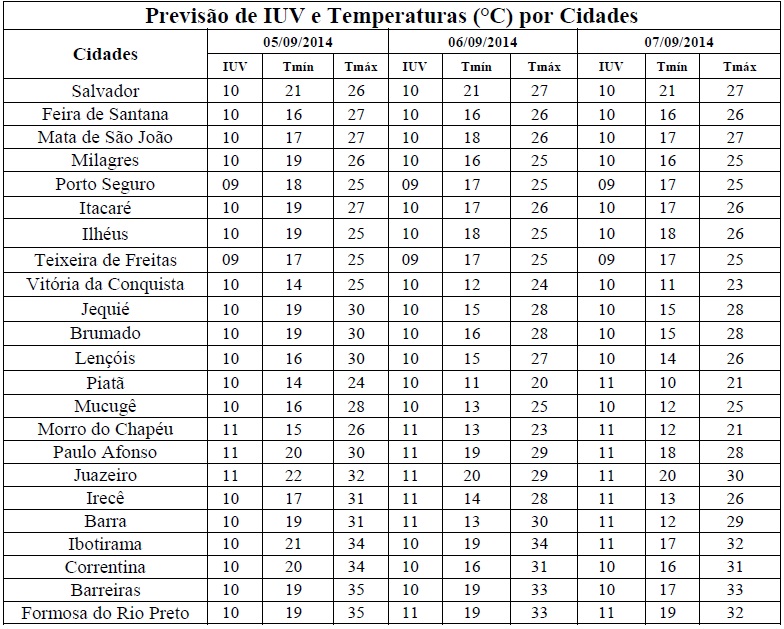 No mês que inicia a estação da primavera, a tendência é que ocorra uma elevação nas temperaturas e, consequentemente, nos Índices de Radiação Ultravioleta (IUV's), como os que estão previstos para o período entre os dias 05/09 (sexta-feira) e 07/08 (domingo), quando deverão variar de 09 a 11. Segundo a Organização Mundial de Saúde (OMS) estes Índices estão classificados, respectivamente, nas categorias “Muito Alto” e “Extremo”, o que é recomendado o uso de protetor/filtro solar, chapéus, bonés, óculos escuros e roupas leves, principalmente, nos horários das 10 às 16 horas. Pois é nesse intervalo de tempo que os efeitos danosos à saúde são maiores.
