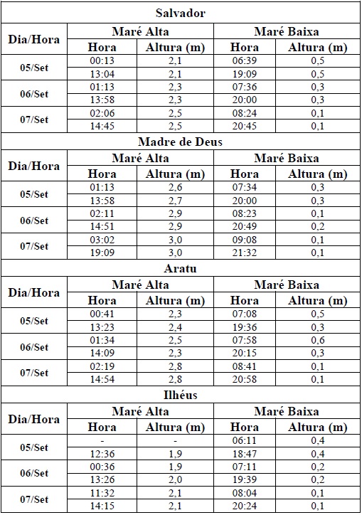 Entre os dias 05/09 (sexta-feira) e 07/09 (domingo), a maré deverá atingir sua altura máxima no período entre 00h30 e 02h30 e entre as 12h30 e às 14h30, com valores variando de 1,9 e 3 metros. Já a altura mínima deverá ser registrada no período entre as 06h30 e às 08h3 e entre 18h30 e 20h30, com valores variando de 0,1 a 0,6 metro. As ondas previstas para esse período deverão ter agitação de moderada a forte, com altura máxima podendo chegar a 3,5 metros.