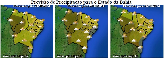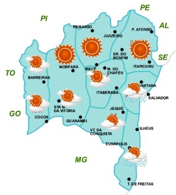 A massa de ar quente e seco, que vinha perdendo força nessa última semana, volta a se intensificar. Com isso, as condições do tempo na Bahia previstas para os próximos dias deverão ser de céu ensolarado e sem chuvas na maior parte do Estado.
