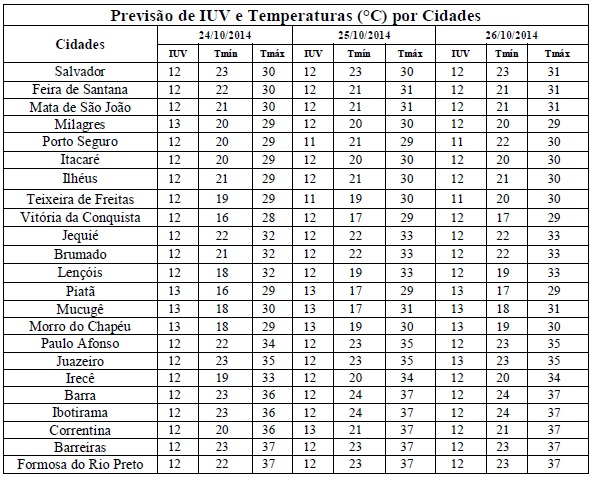 A estação da primavera é o período de transição entre as estações de inverno e do verão, ou seja, nas primeiras semanas as temperaturas são mais amenas e com tempo seco (típica do inverno) e da metade para o final da estação essas temperaturas se elevam e as chuvas ficam mais intensas (típica de verão). Também é nessa estação que há maior incidência de radiação solar no Hemisfério Sul e, consequentemente, dos Índices de Radiação Ultravioleta (IUV's). Esse aumento pode ser visto na previsão para o período entre os dias 24/10 (sexta-feira) e 26/10 (domingo), quando os IUV's deverão variar de 11 a 13. Segundo a Organização Mundial de Saúde (OMS) estes Índices fazem parte da categoria de intensidade “Extrema”, o que requer cuidados quanto à exposição prolongada à radiação solar, principalmente, nos horários das 10 às 16 horas, como: usar protetor/filtro solar, chapéus, bonés, óculos escuros e roupas leves.