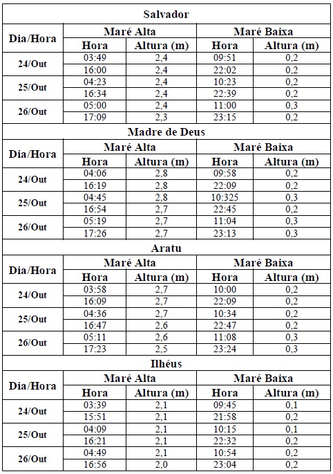 Entre os dias 24/10 (sexta-feira) e 26/10 (domingo), a maré deverá atingir sua altura máxima no período entre as 03h30 e às 05h30 e entre as 15h30 e 17h30, com valores variando de 2 e 2,8 metros. Já a altura mínima deverá ser registrada no período entre as 09h30 e às 12h30 e entre 21h30 e 00h30 (do dia seguinte), com valores variando de 0,1 a 0,3 metro. As ondas previstas para esse período deverão predominar com agitação fraca, com altura máxima podendo chegar a 1,5 metro.