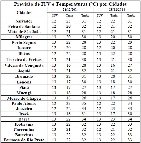 Uma das características da estação do verão é a elevação na incidência da radiação solar e, consequentemente, dos Índices de Radiação Ultravioleta (IUV's). Tal elevação pode ser vista na previsão dos IUV's para os dias 24/12 (quarta-feira) e 25/12 (quinta-feira), quando deverão variar de 12 a 13. Segundo a Organização Mundial de Saúde (OMS), estes Índices estão classificados na categoria “Extrema”, o que requer cuidados quanto à exposição prolongados a radiação solar, principalmente, nos horários das 10 às 16 horas quando os efeitos danosos a saúde são maiores. Assim, recomenda-se o uso de protetor/filtro solar, chapéus, bonés, óculos escuros e roupas leves, o que poderá contribuir para minimizar tais danos.