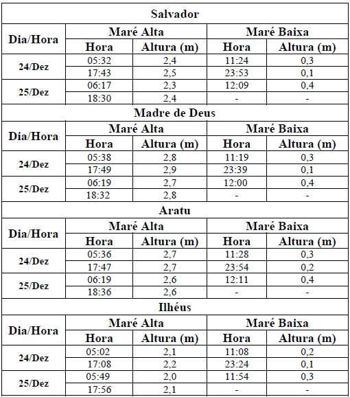 Entre os dias 24/12 (quarta-feira) e 25/12 (quinta-feira), a maré deverá atingir sua altura máxima no período entre as 05h00min e às 07h00min e entre as 17h00min e 19h00min, com valores variando de 2,0 e 2,9 metros. Já as alturas mínimas deverão ser registradas no período entre as 11h00min e 13h00min e entre 23h00min e às 01h00min do dia seguinte, com valores variando de 0,1 a 0,4 metros. As ondas previstas para esse período deverão ter agitação fraca, com altura máxima de até 1,5 metros.
