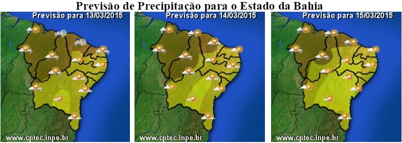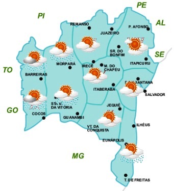 Para os próximos dias, as condições do tempo na Bahia continuam sendo influenciadas, predominantemente, por uma massa de ar quente e seco, o que deverá manter o céu ensolarado e com poucas chuvas na maior parte do Estado.