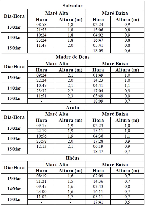 Para o período entre os dias 13/03 (sexta-feira) e 15/03/2015 (domingo), a maré deverá atingir sua altura máxima no período entre as 09h00min e às 12h00min e entre as 21h00min e às 24h00min, com valores variando de 1,5 e 2,3 metros. Já as alturas mínimas deverão ser registradas no período das 03h00min as 06h00min e das 15h00min às 18h00min, com valores variando de 0,5 a 1,1 metro. As ondas previstas para esse período deverão ter agitação fraca, com altura máxima podendo chegar a 1,0 metro.