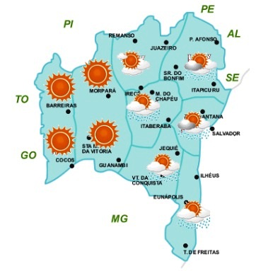Estas chuvas deverão ser de fraca intensidade e mais concentradas no Nordeste, Sul e Recôncavo baiano. Ainda assim, há chances de ocorrer eventos isolados de chuvas mais intensas nas localidades mais próximas ao litoral destas regiões. As temperaturas nessas áreas permanecerão estáveis, com valores variando entre mínimas de 17°C (na região Sul) e máximas de 31°C (na região Nordeste).