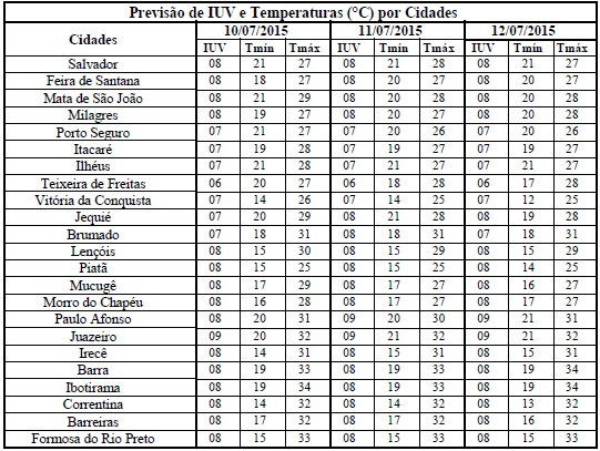 Na estação inverno há uma redução na incidência de radiação solar no Hemisfério Sul, mesmo havendo predominância de céu com poucas nuvens. Consequentemente, ocorre também uma diminuição nos Índices de Radiação Ultravioleta (IUV), como os que estão previstos para previstos para o período de 10/07 (sexta-feira) a 12/07/15 (domingo) na Bahia, quando deverão variar de 06 a 09. De acordo com a Organização Mundial de Saúde (OMS), estes Índices estão classificados nas categorias “Alta e Muito Alta”, o que requer cuidados quanto à exposição prolongada à radiação solar, principalmente, nos horários das 10 às 16 horas, quando os efeitos danosos à saúde são maiores. Para isso, a sugestão é utilizar protetor/filtro solar, chapéus, bonés, óculos escuros e roupas leves.