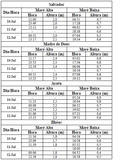 Para o período entre os dias 10/07 (sexta-feira) e 12/07/2015 (domingo), a maré deverá atingir sua altura máxima no período entre às 11h e às 14h e entre às 23h e às 02h do dia seguinte, com valores variando de 1,7 e 2,5 metros. Já as alturas mínimas deverão ser registradas no período entre às 05h e 08h e entre às 17h às 20h, com valores variando de 0,4 a 0,9 metro. As ondas previstas para esse período deverão ter agitação fraca, com altura máxima podendo chegar a 1,5 metro.
