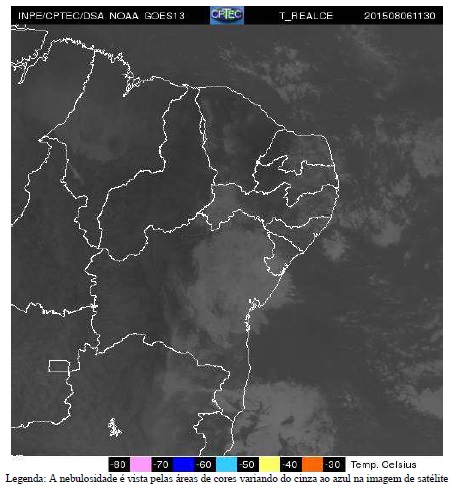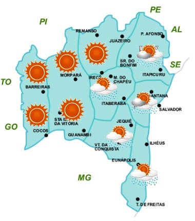 Por outro lado, na faixa centro-oeste e norte, que inclui as regiões Oeste, São Francisco, Norte e setor oeste da Chapada Diamantina e Sudoeste, o tempo continua influenciado, predominantemente, pela massa de ar seco, o que mantém o céu ensolarado. Devido a essa pouca nebulosidade, também é nessas áreas onde são esperadas as temperaturas mais elevadas do Estado, principalmente, no período da tarde quando as máximas poderão chegar aos 33°C. Já durante a noite, essa pouca nebulosidade também contribui para a queda dessas temperaturas, especificamente nas áreas serranas, onde as mínimas poderão chegar aos 12°C.
