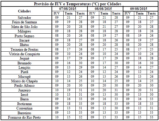 Uma das características da estação do inverno é a redução nos Índices de Radiação Ultravioleta (IUV's). Entretanto, a condição de céu com poucas nuvens, resulta na elevação desses Índices, como os que estão previstos para o período entre os dias 07/08 (sexta-feira) e 09/08 (domingo), quando deverão variar de 08 a 10. Segundo a Organização Mundial de Saúde (OMS) estes Índices estão classificados na categoria “Muito Alta”, o que é recomendado evitar exposição prolongada à radiação solar, usar protetor/filtro solar, chapéus, bonés, óculos escuros e roupas leves, principalmente, nos horários das 10 às 16h. Cuidados essenciais a fim de minimizar danos à saúde, pois é nesse intervalo de tempo, que os efeitos dos raios solares são maiores.
