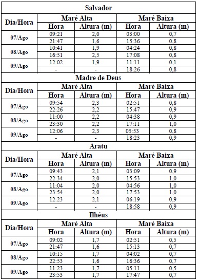 Para o período entre os dias 07/08 (sexta-feira) e 09/08/2015 (domingo), a maré deverá atingir sua altura máxima no período entre às 09h e às 12h e entre às 21h e às 00h, com valores variando de 1,6 a 2,5 metros. Já as alturas mínimas deverão ser registradas no período entre às 03h e 06h e entre às 15h às 18h, com valores variando de 0,5 a 1,0 metro. As ondas previstas para esse período deverão ter agitação de moderada a fraca, com altura máxima podendo chegar aos 2,5 metros.