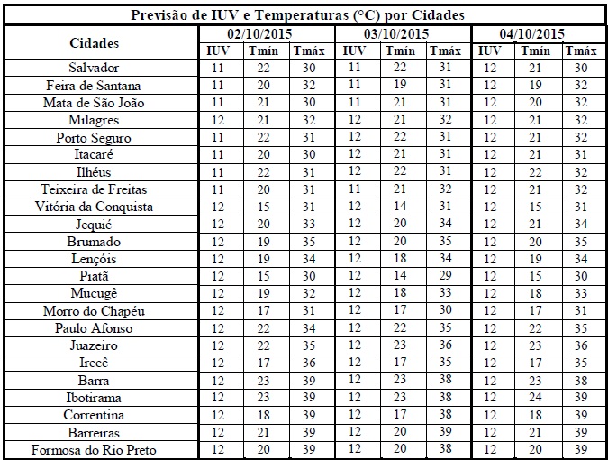 Uma das características da primavera é o aumento da incidência de radiação solar no Hemisfério Sul e, consequentemente, a elevação dos Índices de Radiação Ultravioleta (IUV's). Esse aumento pode ser verificado nos Índices previstos para o período de 02/10 (sexta-feira) a 04/10 (domingo), quando deverão variar de 11 a 12. Segundo a Organização Mundial de Saúde (OMS) estes IUV's estão classificados na categoria de intensidade “Extrema” e, por isso, os cuidados quanto à exposição prolongada à radiação solar devem ser mantidos, principalmente, nos horários das 10 às 16 horas, quando há maior incidência. Para isso, recomenda-se o uso de protetor/filtro solar, chapéus, bonés, óculos escuros e roupas leves.