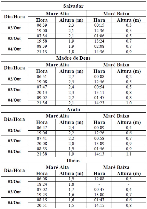 Para o período entre os dias 02 (sexta-feira) e 04 (domingo), a maré deverá atingir sua altura máxima entre 06h e às 09h e entre às 18h e às 21h, com valores variando de 1,5 a 2,7 metros. Já as alturas mínimas deverão ser registradas no período entre às 00h00min e às 03h00min e entre às 12h00min às 15h00min, com valores variando de 0,2 a 1,1 metro. As ondas previstas para esse período deverão ter agitação fraca, com altura máxima podendo chegar a 1,5 metro.