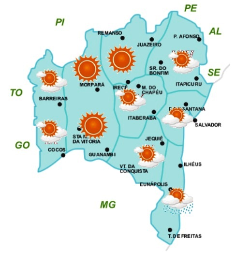 Para os próximos dias o tempo na Bahia segue sem grandes mudanças, principalmente, no Oeste, São Francisco e Norte, pois a massa de ar quente e seco continua atuando com maior intensidade nessas regiões, mantendo a nebulosidade e as chances de ocorrer chuvas reduzidas. As temperaturas nessas áreas permanecem elevadas, com máximas podendo atingir 40ºC, o que pode contribuir para a ocorrência de chuvas isoladas, especificamente, no extremo oeste baiano.