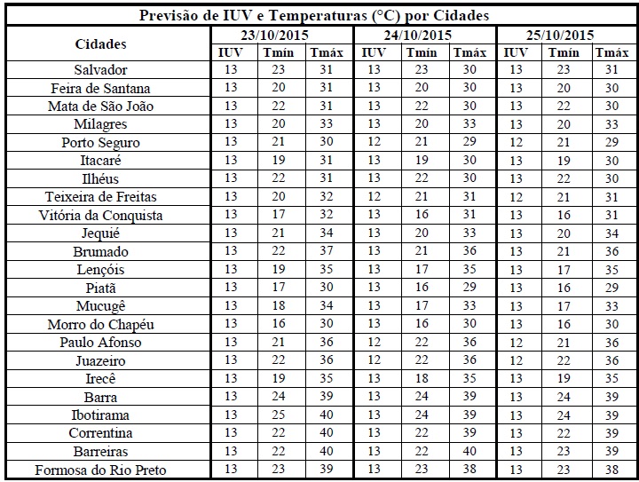 Uma das características da primavera é o aumento da incidência de radiação solar e, consequentemente, a elevação dos Índices de Radiação Ultravioleta (IUV's). Esse aumento pode ser verificado entre os dias 23 (sexta-feira) e 25 (domingo), quando os Índices previstos deverão variar de 12 a 13. Segundo a Organização Mundial de Saúde (OMS) estes IUV's estão classificados na categoria de intensidade “Extrema” e, por isso, os cuidados quanto à exposição prolongada à radiação solar devem ser mantidos, principalmente, nos horários das 10 às 16 h, quando há maior incidência. Para isso, recomenda-se o uso de protetor/filtro solar, chapéus, bonés, óculos escuros e roupas leves.