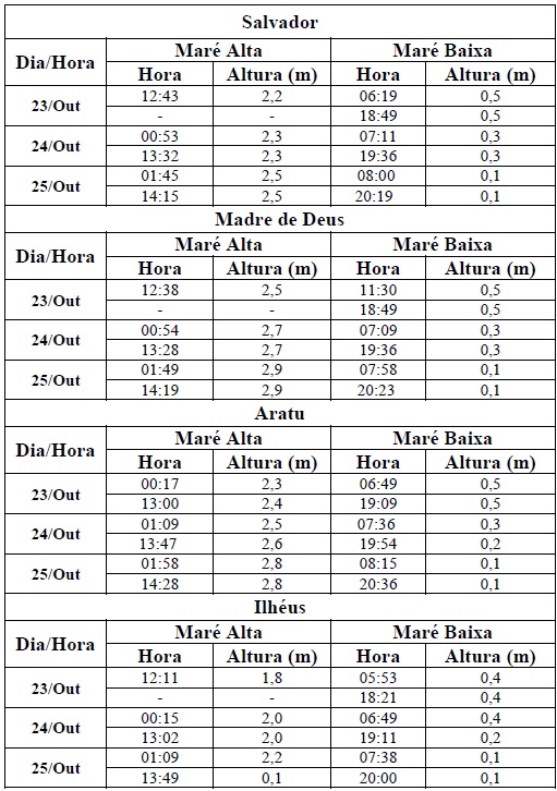 Para o período entre os dias 23/10 (sexta-feira) e 25/10/2015 (domingo), a maré deverá atingir sua altura máxima entre 00h às 03h e entre 12h às 15h, com valores variando de 1,8 a 2,9 metros. Já as alturas mínimas deverão ser registradas no período entre às 06h e às 09h e entre 18h às 21h, com valores variando de 0,1 a 0,5 metros. As ondas previstas para esse período deverão ter agitação fraca, com altura máxima podendo chegar a 1,5 metros.