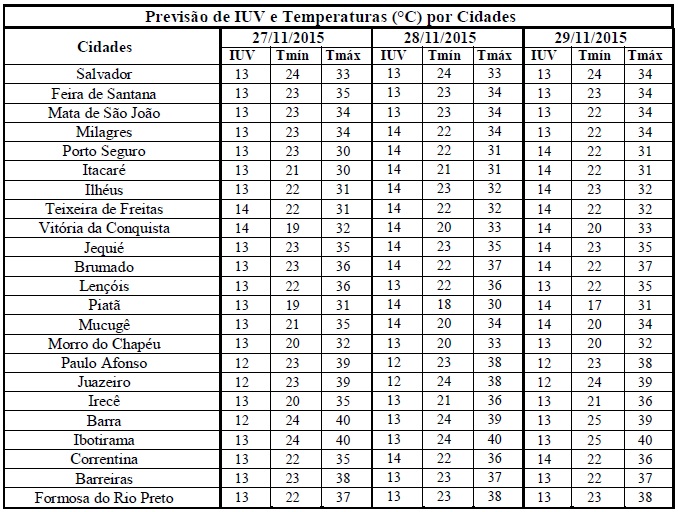 A primavera é a estação de transição entre as estações de inverno e do verão, ou seja, nas primeiras semanas as temperaturas são mais amenas e com tempo seco (típica do inverno) e da metade para o final da estação essas temperaturas se elevam e as chuvas ficam mais intensas (típica de verão). Também é nessa estação que há maior incidência de radiação solar e, consequentemente, elevação dos Índices de Radiação Ultravioleta (IUV's). Esse aumento pode ser visto na previsão para o período de 27 (sexta-feira) a 29 (domingo), quando os IUV's deverão variar de 12 a 14. Segundo a Organização Mundial de Saúde (OMS) estes Índices fazem parte da categoria de intensidade “Extrema”, o que requer cuidados quanto à exposição prolongada à radiação solar, principalmente, nos horários das 10 às 16h, como: usar protetor/filtro solar, chapéus, bonés, óculos escuros e roupas leves.