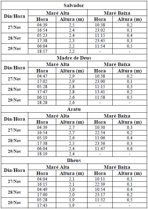 Para o período entre os dias 27 (sexta-feira) e 29 (domingo), a maré deverá atingir sua altura máxima entre às 04h e às 06h e entre às 16h e às 18h, com valores variando de 1,9 a 2,9 metros. Já as alturas mínimas deverão ser registradas no período entre às 10h e às 12h e entre às 22h e às 00h, com valores variando de 0,1 a 0,6 metro. As ondas previstas para esse período deverão ter agitação fraca, com altura máxima podendo chegar a 1,5 metro.