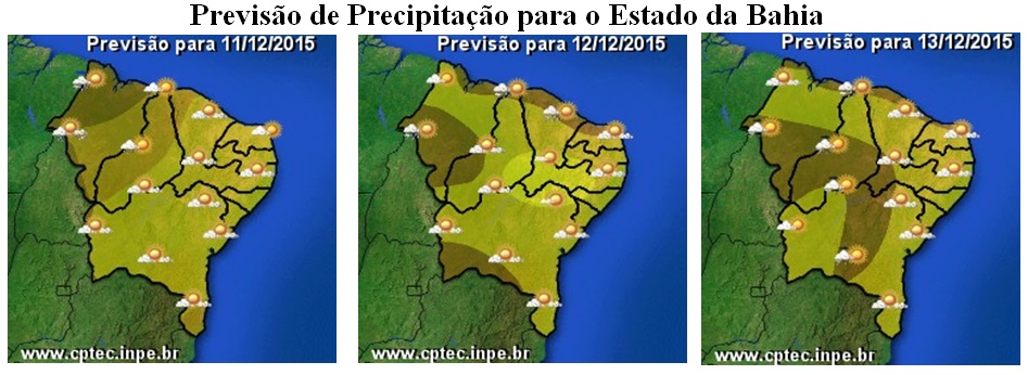 Para o final de semana não são esperadas mudanças significativas nas condições do tempo, pois a massa de ar quente e seco continua ganhando força, mantendo o céu ensolarado sobre grande parte do Nordeste brasileiro. Na Bahia, esse sistema, além de inibir a ocorrência de chuvas, também está contribuindo para manter as temperaturas elevadas em todas as regiões. No entanto, é na faixa centro-norte do Estado, que inclui o Nordeste, Norte e parte do Oeste e São Francisco, onde estão previstos os maiores índices, com máximas variando entre 35°C e 39°C.