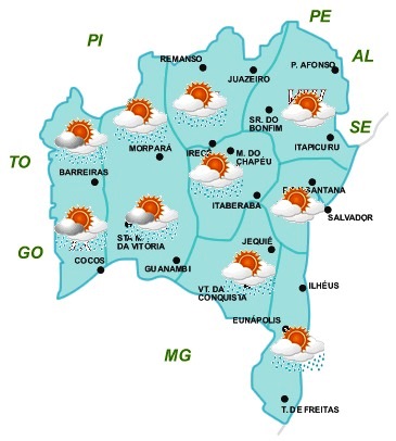 Para as demais regiões do Estado, onde a massa de ar quente e seco deve atuar com mais intensidade, a previsão é de céu parcialmente nublado com chuvas fracas. No entanto, as maiores chances de que essas chuvas ocorram são para as regiões Norte, Chapada Diamantina, Sudoeste e Sul. Além disso, a volta dessa massa de ar também irá contribuir para elevar as temperaturas em algumas regiões, como: no Norte e Nordeste, onde as máximas poderão chegar aos 36°C.