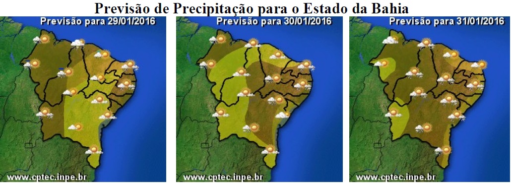 As condições do tempo previstas para os próximos dias, que inclui o último final de semana de janeiro, deverão ter mudanças significativas, principalmente, em relação às chuvas. Pois, com a volta da massa de ar quente e seco, a Zona de Convergência do Atlântico Sul continua enfraquecendo, o que resulta na redução da nebulosidade e, consequentemente, das chuvas em grande parte da Bahia.