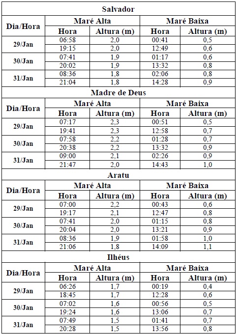 Para o período entre os dias 29 (sexta-feira) e 31 (domingo), a maré deverá atingir sua altura máxima entre às 06h30 e às 09h30 e entre às 18h30 e às 21h30, com valores variando de 1,5 a 2,3 metros. Já as alturas mínimas deverão ser registradas no período entre as 00h30 e às 03h30 e entre às 12h30 e às 15h30, com valores variando de 0,4 a 1,1 metro. As ondas previstas para esse período deverão ter agitação fraca, com altura máxima em torno de 1,5 metro.