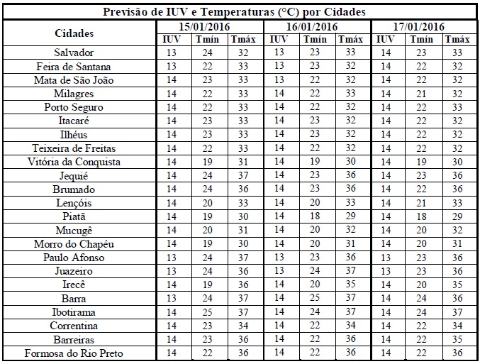Uma das características da estação do verão é a elevação na incidência da radiação solar e, consequentemente, dos Índices de Radiação Ultravioleta (IUV's), a exemplo dos que estão previstos para o período entre os dias 15 (sexta-feira) e 17 (domingo), quando os IUV's deverão variar de 13 a 14. Segundo a Organização Mundial de Saúde (OMS), estes Índices estão classificados na categoria “Extrema”, o que requer cuidados quanto à exposição prolongados a radiação solar, principalmente, nos horários das 10 às 16h quando os efeitos danosos a saúde são maiores. Assim, recomenda-se o uso de protetor/filtro solar, chapéus, bonés, óculos escuros e roupas leves, o que poderá contribuir para minimizar tais danos.