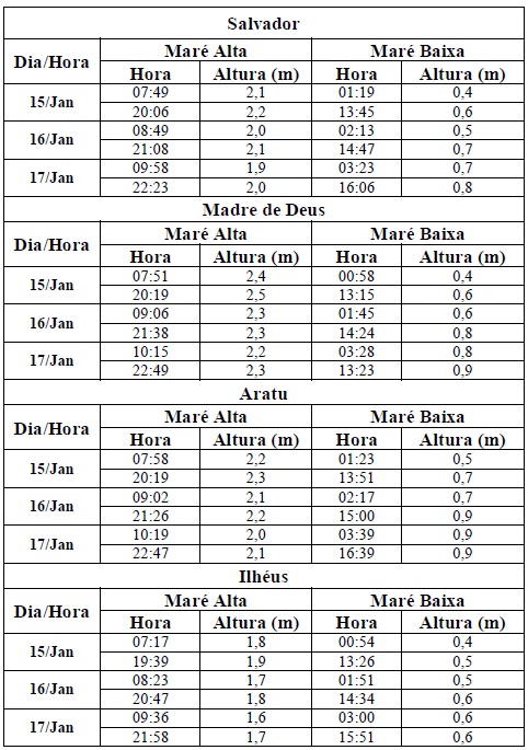 Para o período entre os dias 15 (sexta-feira) e 17 (domingo), a maré deverá atingir sua altura máxima entre às 07h e às 10h e entre às 19h e às 22h, com valores variando de 1,6 a 2,5 metros. Já as alturas mínimas deverão ser registradas no período entre 01h e às 04h e entre às 13h e às 16h, com valores variando de 0,4 a 0,9 metro. As ondas previstas para esse período deverão ter agitação fraca, com altura máxima em torno de 1,5 metro.