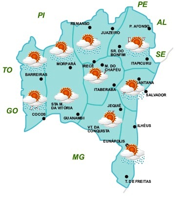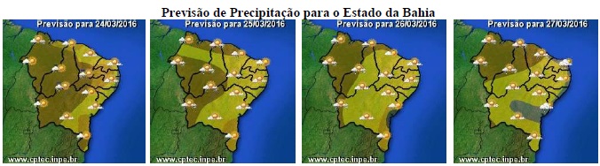 Para este período que inclui o final de semana prolongado devido ao feriado da Semana Santa, não estão previstas mudanças expressivas nas condições do tempo na Bahia, ou seja, a massa de ar quente e seco continua atuando na maior parte do Estado, mantendo a nebulosidade e as chuvas reduzidas.