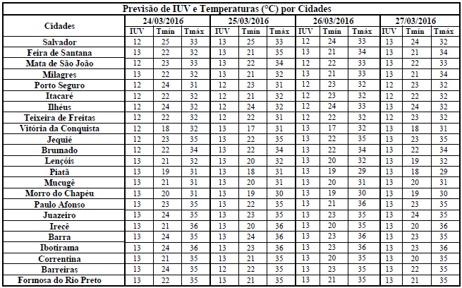 Os Índices de Radiação Ultravioleta (IUV's), previstos dias 24 e 27, deverão variar entre 12 e 13. De acordo com a Organização Mundial de Saúde (OMS), tais Índices estão classificados na categoria “Extrema”, o que requer cuidados quanto à exposição prolongados a radiação solar, principalmente, nos horários das 10 às 16h quando os efeitos danosos a saúde são maiores. Assim, recomenda-se o uso de protetor/filtro solar, chapéus, bonés, óculos escuros e roupas leves, o que poderá contribuir para minimizar tais danos.