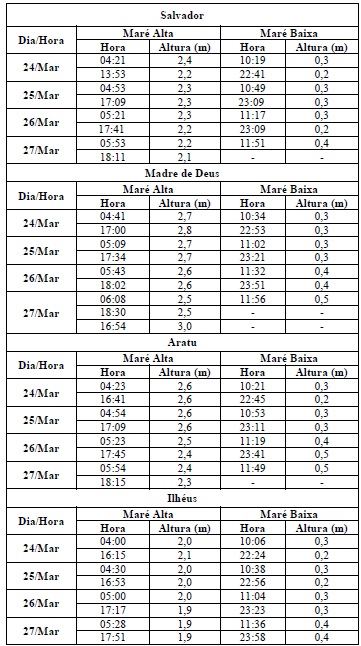 Para o período entre os dias 24 e 27, a maré deverá atingir sua altura máxima no período entre às 04h e 06h e entre às 16h e 18h, com valores variando de 1,9 e 3,0 metros. Já as alturas mínimas deverão ser registradas no período entre às 10h e 12h e entre às 22h e 00h, com valores variando de 0,2 a 0,5 metro. As ondas previstas para esse período deverão ter agitação fraca, com altura máxima podendo chegar a 1,5 metro.