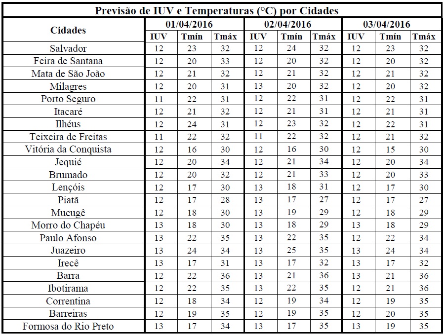 Os Índices de Radiação Ultravioleta (IUV's), previstos dias 01 (sexta-feira) e 03 (domingo), deverão variar entre 11 e 13. De acordo com a Organização Mundial de Saúde (OMS), tais Índices estão classificados na categoria “Extrema”, o que requer cuidados quanto à exposição prolongados a radiação solar, principalmente, nos horários das 10 às 16h quando os efeitos danosos a saúde são maiores. Assim, recomenda-se o uso de protetor/filtro solar, chapéus, bonés, óculos escuros e roupas leves, o que poderá contribuir para minimizar tais danos.