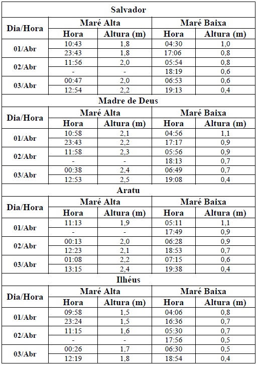 Para o período entre os dias 01 (sexta-feira) e 03 (domingo), a maré deverá atingir sua altura máxima no período de 10h às 13h e 22h à 01h do dia seguinte, com valores variando de 1,5 e 2,5 metros. Já as alturas mínimas deverão ser registradas no período entre 16h e às 19h e 04h e às 07h, com valores variando de 0,4 a 1,1 metro. As ondas previstas para esse período deverão ter agitação fraca, com altura máxima podendo chegar a 1,5 metro.