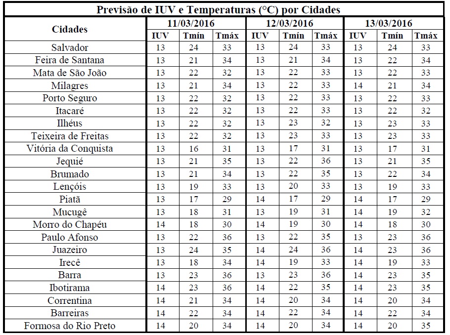 A estação do verão tem com uma de suas características a elevação na incidência da radiação solar e, consequentemente, dos Índices de Radiação Ultravioleta (IUV's), a exemplo dos que estão previstos para os dias 11 (sexta-feira) e 13 (domingo), quando estes Índices deverão variar de 13 a 14. De acordo com a Organização Mundial de Saúde (OMS), tais Índices estão classificados na categoria “Extrema”, o que requer cuidados quanto à exposição prolongados a radiação solar, principalmente, nos horários das 10 às 16h quando os efeitos danosos a saúde são maiores. Assim, recomenda-se o uso de protetor/filtro solar, chapéus, bonés, óculos escuros e roupas leves, o que poderá contribuir para minimizar tais danos.