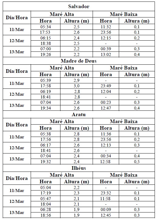Para o período entre os dias 11 e 13 (domingo), a maré deverá atingir sua altura máxima no período entre a 05h e às 07h e entre às 17h e às 19h, com valores variando de 1,9 e 3,0 metros. Já as alturas mínimas deverão ser registradas no período entre às 11h e às 13h e entre as 23h e à 01h do dia seguinte, com valores variando de 0,1 a 0,5 metro. As ondas previstas para esse período deverão ter agitação fraca, com altura máxima podendo chegar a 1,0 metro.
