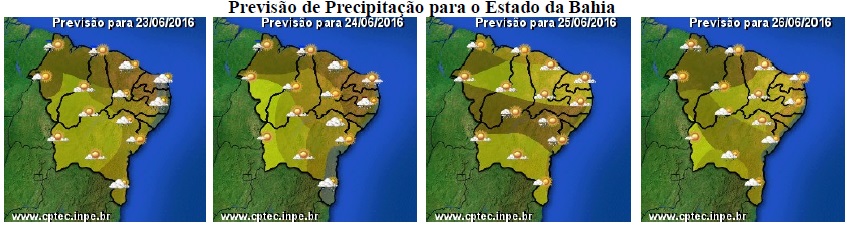 As condições do tempo previstas para a Bahia, nesse primeiro final de semana do inverno que, também coincide com o feriado de São João, não deverão ter mudanças significativas, ou seja, continuam sendo influenciadas por sistemas meteorológicos de diferentes características e em áreas distintas. Na faixa centro-oeste e norte, que inclui as regiões Oeste, São Francisco e Norte, é a massa de ar seco que continua predominando, onde deverá manter o céu com poucas nuvens e sem chuvas.