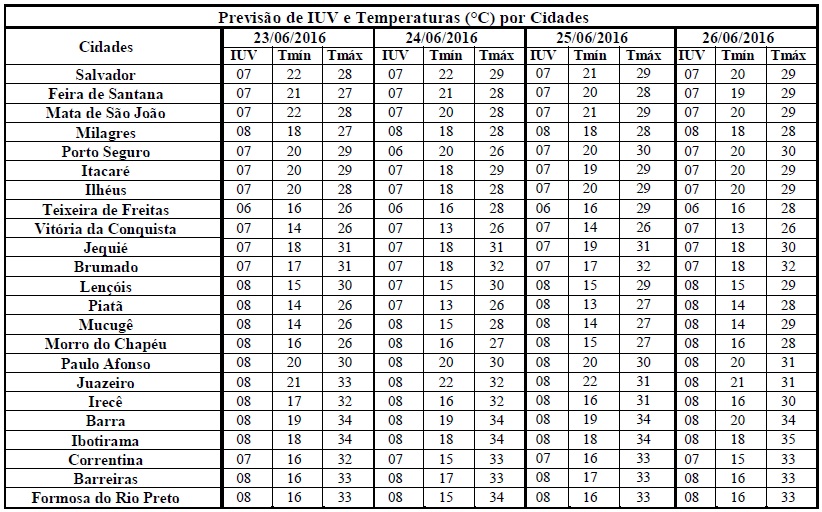 O inverno tem como uma de suas características a diminuição na intensidade de radiação solar sobre o Hemisfério Sul e, consequentemente, redução nos Índices de Radiação Ultravioleta (IUV's). Tal redução pode ser observada nos Índices previstos para o período de 23/06 (quinta-feira) e 26/06 (domingo) que deverão variar de 06 a 08. Segundo a Organização Mundial de Saúde (OMS), estes Índices estão classificados nas categorias “Alta” e “Muito Alta”, o que requer cuidados quanto à exposição prolongada à radiação solar, principalmente, nos horários entre 10h às 16 h. Com isso, recomenda-se a utilização de protetor/filtro solar, chapéus, bonés, óculos escuros e roupas leves, minimizando, assim, danos à saúde, sobretudo, a pele e aos olhos.