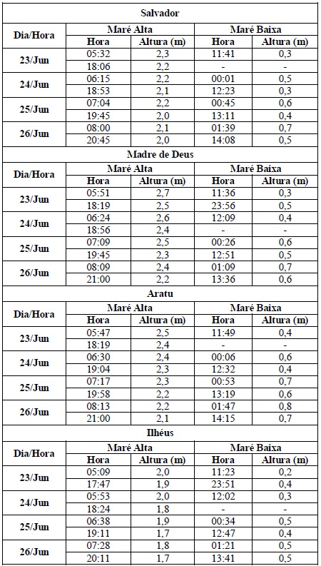 Para o período entre os dias 23/06 (quinta-feira) e 26/06/2016 (domingo), a maré deverá atingir sua altura máxima no período entre 05h às 09h e entre 17h às 21h com valores variando de 1,7 a 2,7 metros. Já as alturas mínimas deverão ser registradas no período entre 23h às 03h (do dia seguinte) e entre 11h às 15h, com valores variando de 0,2 a 0,8 metro. As ondas previstas deverão ter agitação fraca, com altura máxima podendo chegar a 1,5 metro.