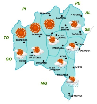 Assim, para as regiões do Recôncavo, Sul, Sudoeste e setor centro-sul do Oeste e São Francisco, onde estão sob a influência dessa frente fria, a previsão é de céu nublado a parcialmente nublado com possibilidade de chuvas fracas. No entanto, estas chuvas deverão ser mais concentradas no Sul do Estado, onde não se descarta a ocorrência de acumulados significativos pontuais de chuva.