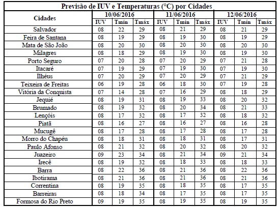 Os Índices de Radiação Ultravioleta (IUV's) previstos para o período de 10 (sexta-feira) a 12 (domingo) deverão variar de 06 a 09, o que segundo a Organização Mundial de Saúde (OMS) estão classificados nas categorias “Alta e Muito Alta”. Assim, a OMS recomenda cuidados quanto a exposição prolongada à radiação solar, principalmente, nos horários entre 10h às 16h, como: utilizar protetor/filtro solar, chapéus, bonés, óculos escuros e roupas leves, minimizando, assim, danos à saúde, sobretudo, a pele e aos olhos.