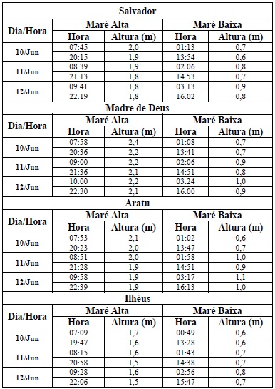 Para o período entre os dias 10 (sexta-feira) e 12 (domingo), a maré deverá atingir sua altura máxima no período entre 07h e às 10h e entre 19h às 22h com valores variando de 1,5 a 2,4 metros. Já as alturas mínimas deverão ser registradas no período entre 01h às 04h e entre 13h às 16h, com valores variando de 0,6 a 1,1 metro. As ondas previstas deverão ter agitação fraca, com altura máxima podendo chegar a 1,5 metro.