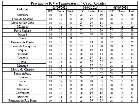 Os Índices de Radiação Ultravioleta (IUV's) previstos para o período de 03 (sexta-feira) a 05 (domingo) deverão variar de 07 a 09, o que segundo a Organização Mundial de Saúde (OMS) estão classificados nas categorias “Alta e Muito Alta”. Assim, a OMS recomenda cuidados quanto a exposição prolongada à radiação solar, principalmente, nos horários entre 10 às 16h, como: utilizar protetor/filtro solar, chapéus, bonés, óculos escuros e roupas leves, minimizando, assim, danos à saúde, sobretudo, a pele e aos olhos.