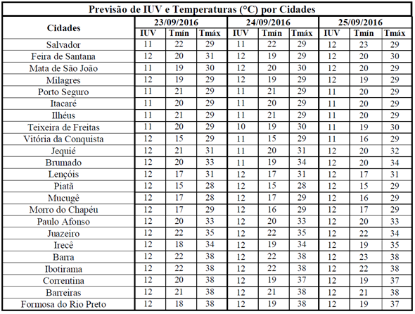 Uma das características do início da primavera é a elevação nos Índices de Radiação Solar e, consequentemente, a Radiação Ultravioleta. Tal mudança se deve, principalmente, a condição de céu com poucas nuvens, o que resulta na elevação desses Índices, a exemplo dos que estão previstos para o período entre os dias 23/09 (sexta-feira) e 25/09 (domingo), que deverão variar de 10 a 12. Segundo a Organização Mundial de Saúde (OMS) estes Índices estão classificados nas categorias “Muito Alta e Extrema”, o que requer cuidados quanto exposição prolongada à radiação solar. Com isso, recomenda-se usar protetor/filtro solar, chapéus, bonés, óculos escuros e roupas leves, sobretudo, nos horários das 10 às 16 horas. Esses cuidados são essenciais, pois poderão minimizar danos à saúde, uma vez que, nesse intervalo de tempo os efeitos dos raios solares são maiores.