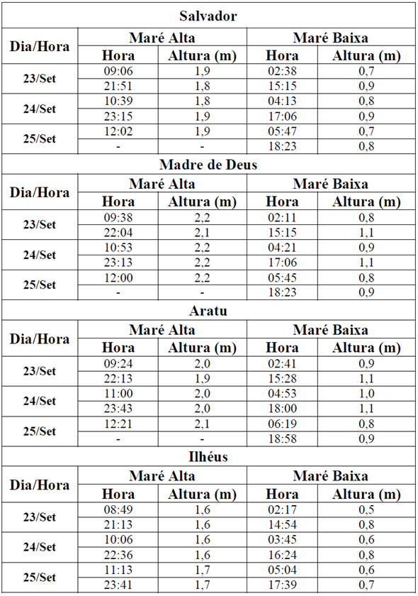 Para o período entre os dias 23/09 (sexta-feira) e 25/09/2016 (domingo), a maré deverá atingir sua altura máxima no período entre às 08h00min e às 12h00min e entre às 20h00min e às 24h00min com valores variando de 1,6 a 2,2 metros. Já as alturas mínimas deverão ser registradas no período entre às 02h00min e às 06h00min e entre às 14h00min e às 18h00min, com valores variando entre 0,5 e 1,1 metro. As ondas previstas deverão ter agitação fraca, com altura máxima podendo chegar a 1,5 metro.