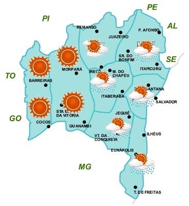 Para as áreas onde há previsão de chuvas, as temperaturas serão mais amenas, com mínimas variando entre 17°C (na Chapada Diamantina e Sudoeste) e máximas de 34°C (no Nordeste do Estado). Para a cidade de Salvador e região metropolitana, onde o céu se manterá parcialmente nublado e com chuvas, as temperaturas deverão variar de 22°C (mínimas) e 30°C (máximas).