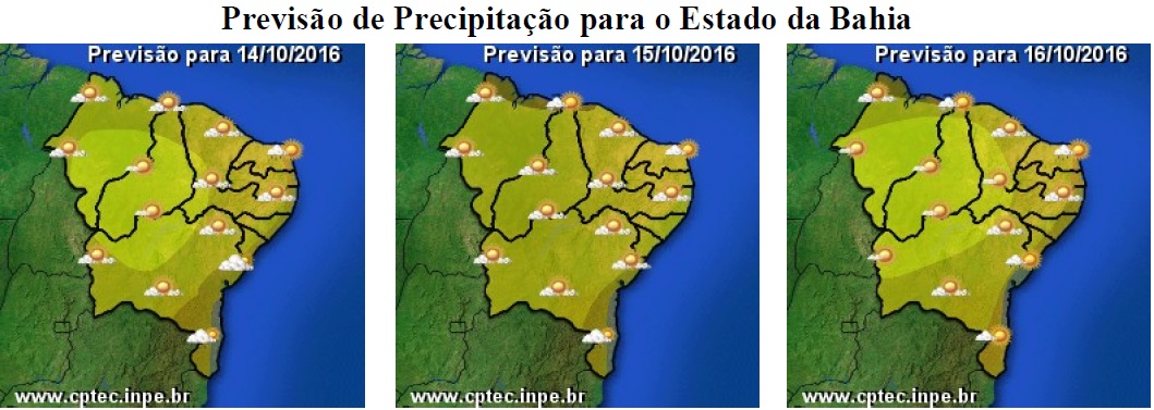Para os próximos dias, que inclui o final de semana, o tempo na Bahia continua sem mudanças significativas. Ou seja, na faixa centro-leste, que inclui as regiões do Recôncavo, Nordeste, Chapada Diamantina, Sudoeste e Sul, quem influencia são ventos úmidos vindos do Oceano Atlântico, o que deverão manter o céu parcialmente nublado, com possibilidade de chuvas fracas a qualquer hora do dia.