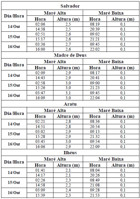 Para o período entre os dias 14 (sexta-feira) e 16 (domingo), a maré deverá atingir sua altura máxima no período entre 02h às 04h e entre 14h às 16h com valores variando de 2,1 a 3,1 metros. Já as alturas mínimas deverão ser registradas no período entre 08h às 10h e entre 20h às 22h, com valores em torno de 0,1 metro. As ondas previstas deverão ter agitação de fraca a moderada, com altura máxima podendo chegar a 2,0 metros.