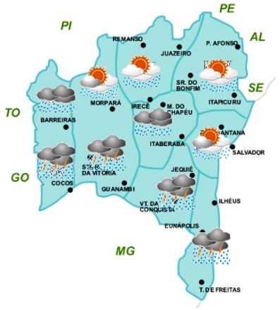 Como típico dessa época do ano, as chuvas normalmente ocorrem a qualquer hora do dia, uma vez que, há predomínio de temperatura e umidade elevadas. No entanto, é no final da tarde e durante a noite que ocorrem os volumes mais expressivos dessas chuvas, a exemplo dos que estão previstos para as regiões Oeste, São Francisco, Chapada Diamantina, Sudoeste e Sul. Além disso, a possibilidade de trovoadas não está descartada em algumas áreas dessas regiões, sobretudo naquelas com temperaturas mais elevadas.