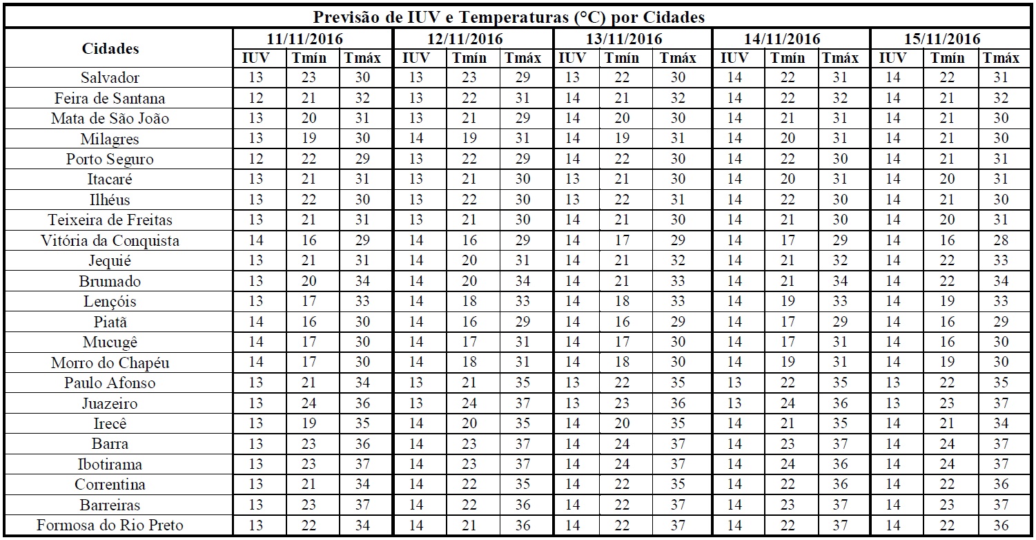 Uma das características da primavera é a elevação nos Índices de Radiação Solar e, consequentemente, da Radiação Ultravioleta (IUV's). Tal mudança é mais frequente na primeira metade da estação quando há predomínio de céu com poucas nuvens. Na segunda metade dessa estação, quando o céu fica encoberto pela nebulosidade estes IUV's também permanecem elevados, a exemplo do que estão previstos para o período entre os dias 11/11 (sexta-feira) e 15/11 (terça-feira), quando deverão variar de 12 a 14. Segundo a Organização Mundial de Saúde (OMS) estes Índices estão classificados na categoria “Extrema”, o que requer cuidados quanto exposição prolongada à radiação solar. Com isso, recomenda-se usar protetor/filtro solar, chapéus, bonés, óculos escuros e roupas leves, sobretudo, nos horários das 10 às 16 horas. Esses cuidados são essenciais, pois poderão minimizar danos à saúde, uma vez que, nesse intervalo de tempo os efeitos dos raios solares são maiores.